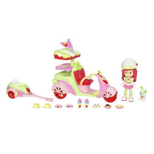 Strawberry Shortcake has baked up sweet treats in her Berry Cafe, and she's delivering them door-to-door. Help her use her scooter to delivery the yummy "cake", "cupcakes", "pie" and more to her customers. Set includes scented mini Strawberry Shortcake figure, PupcakeTM the puppy figure and skirt, helmet, scooter, trailer, two plates with slices of cake, two plates of sandwiches, plate of muffins, plate of cupcakes, berry pie and two smoothies accessories. Read more...