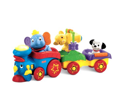 The Fisher-Price Amazing Animals Disney Baby Sing-Along Choo- Choo brings three of your baby's favorite Disney character friends to classic Fisher-Price push-along, roll-along, crawl-along choo-choo train fun! Babies can join Dumbo, Simba, and Lucky on an exciting adventure fueled by imagination--and more than 15 sing-along songs, tunes, and phrases, including a familiar tune from the movie! As your baby rolls the train along, music and a light-up smoke stack are activated.